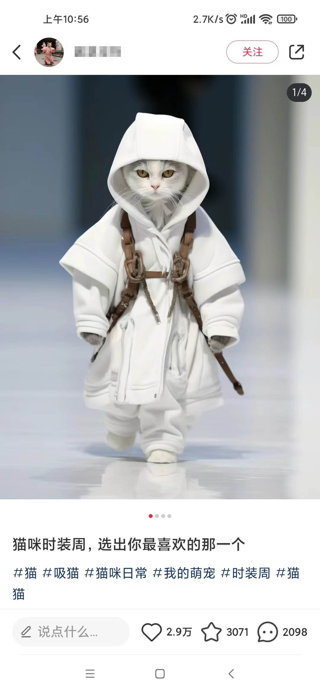 Animal秀在小红书上是非常爆款的项目,动不动就几万的赞,笔记的内容主要是猫咪走秀搭配一段文案,就是一只猫穿着人类的衣服在走T台,看起来非常的新奇特,加上小红书的主要用户群体是女性用户,女大学生,少女,宝妈这类,而大部分女性都是比较喜欢猫咪这类动物,加上我们的猫咪图片非常的可爱或者酷帅,很难不爱。